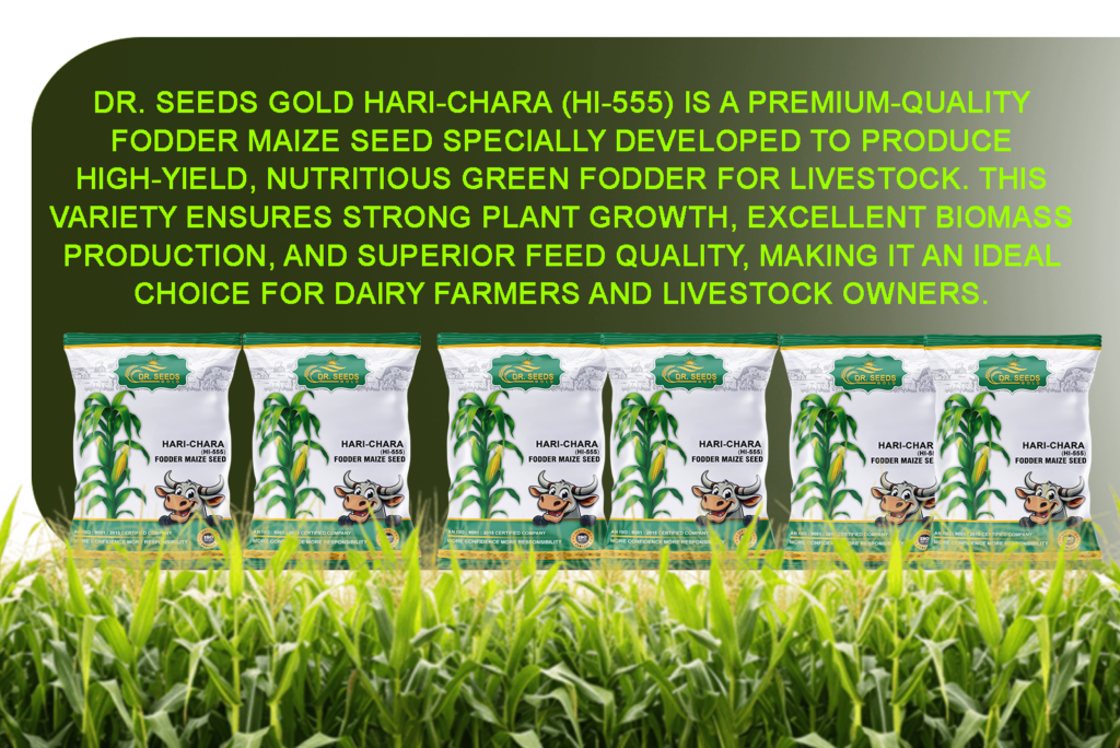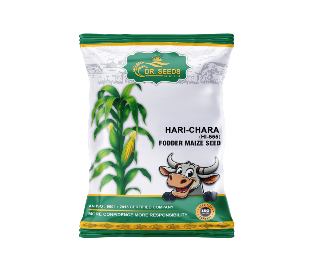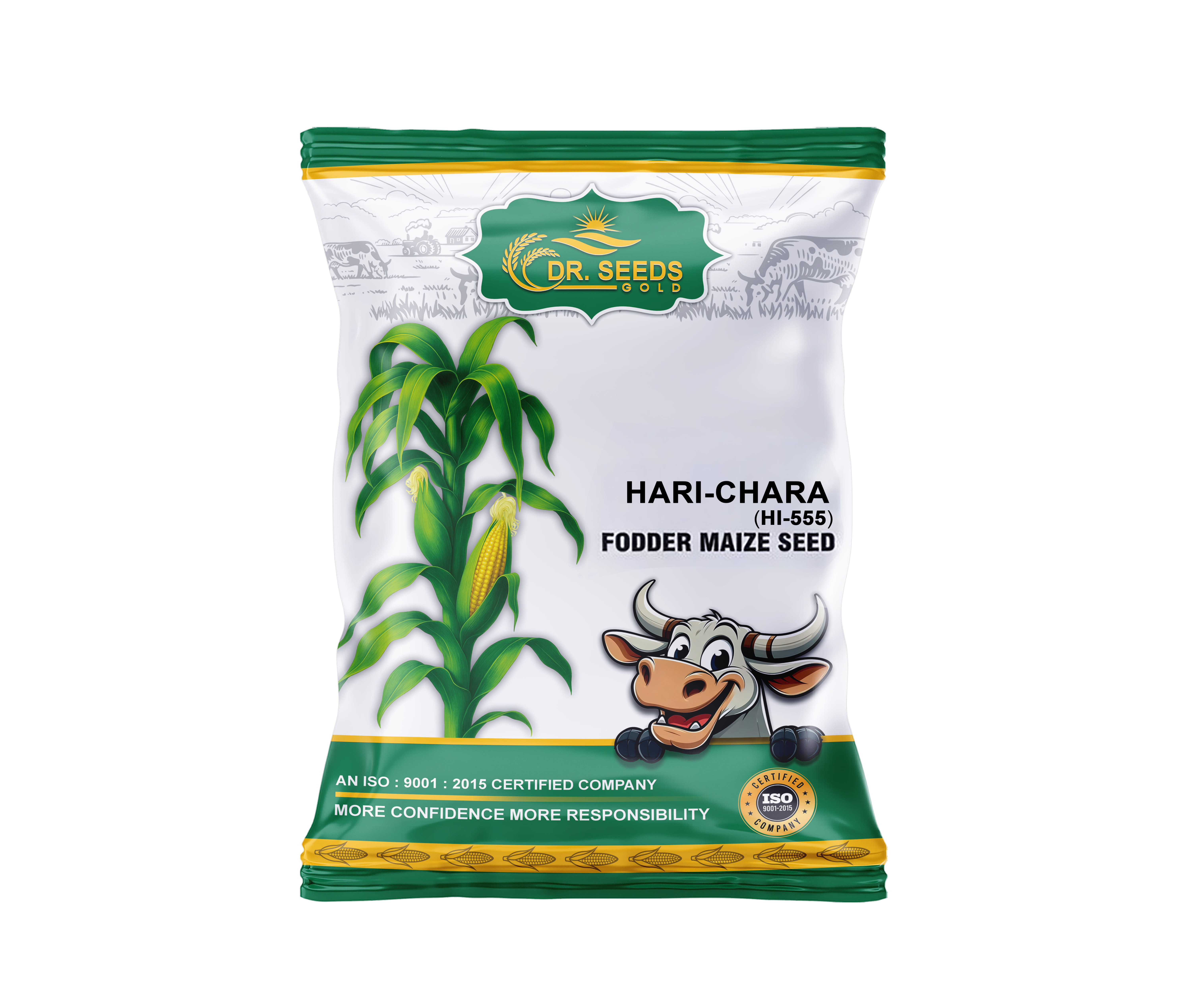 DR. SEEDS GOLD HARI-CHARA (HI-555) FODDER MAIZE SEED IS A PREMIUM FODDER MAIZE VARIETY SPECIALLY DEVELOPED TO HELP FARMERS PRODUCE ABUNDANT, HIGH-QUALITY GREEN FODDER FOR THEIR LIVESTOCK. THIS ADVANCED SEED VARIETY IS KNOWN FOR ITS VIGOROUS GROWTH, STRONG PLANT STRUCTURE, AND HIGH BIOMASS PRODUCTION, ENSURING FARMERS GET A RELIABLE AND NUTRITIOUS FODDER CROP IN A SHORT PERIOD OF TIME. HARI-CHARA (HI-555) PRODUCES TALL, LEAFY, AND SUCCULENT MAIZE PLANTS THAT ARE HIGHLY PALATABLE FOR COWS, BUFFALOES, AND OTHER DAIRY ANIMALS, MAKING IT AN EXCELLENT CHOICE FOR IMPROVING LIVESTOCK HEALTH AND MILK PRODUCTIVITY. THE CROP ADAPTS WELL TO DIFFERENT SOIL TYPES AND CLIMATIC CONDITIONS, OFFERING CONSISTENT GERMINATION, UNIFORM CROP STAND, AND BETTER FIELD PERFORMANCE. WITH ITS ABILITY TO PRODUCE DENSE GREEN FODDER RICH IN NATURAL NUTRIENTS, THIS MAIZE VARIETY SUPPORTS BETTER DIGESTION, STRONGER ANIMALS, AND HIGHER DAIRY OUTPUT, WHICH DIRECTLY BENEFITS FARMERS’ INCOME AND SUSTAINABILITY