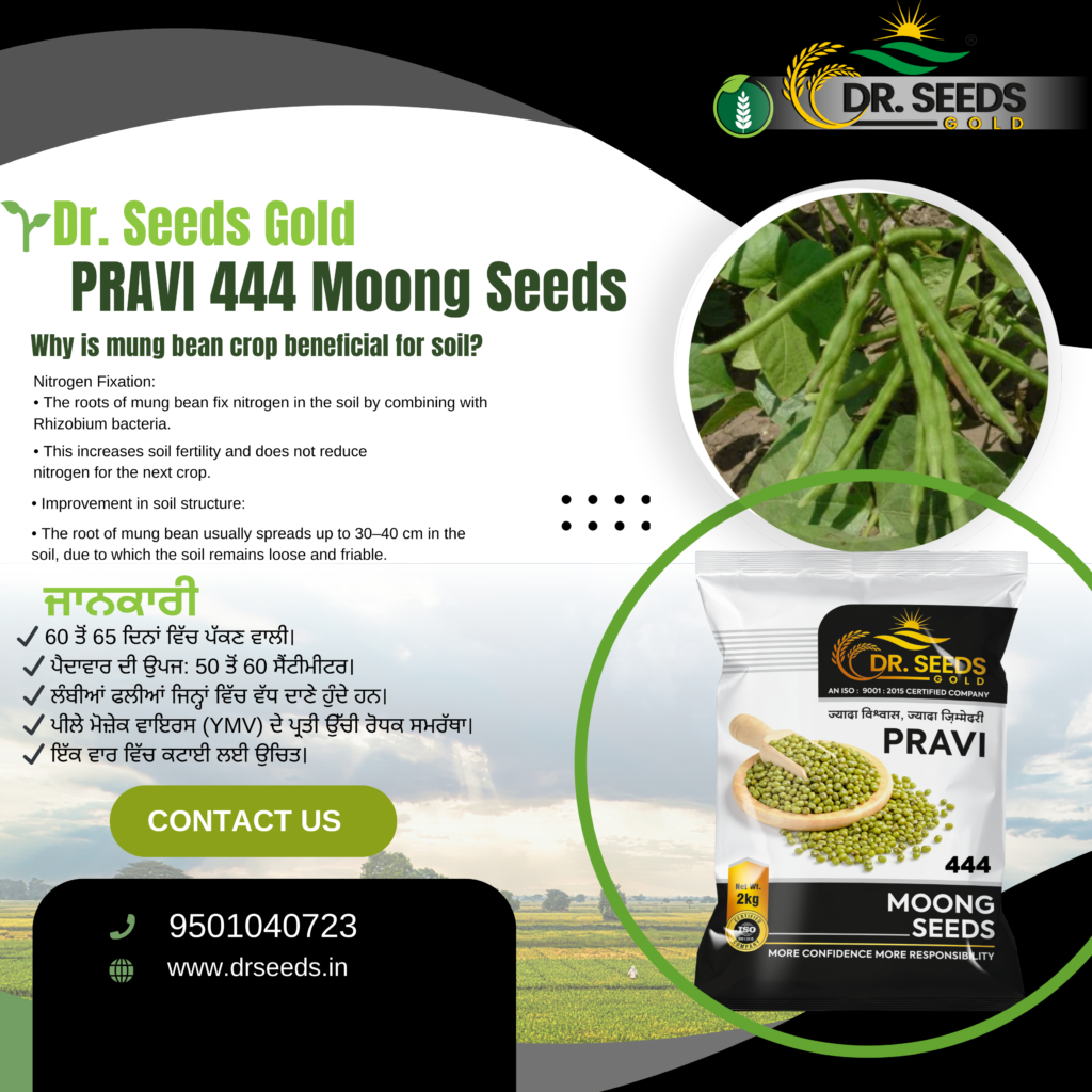 DR. SEEDS GOLD Moong Seeds are high-quality, carefully selected seeds designed to deliver excellent germination, strong crop growth, and high yield for farmers. These seeds are processed with advanced technology and strict quality standards to ensure purity, strength, and reliable performance in the field.